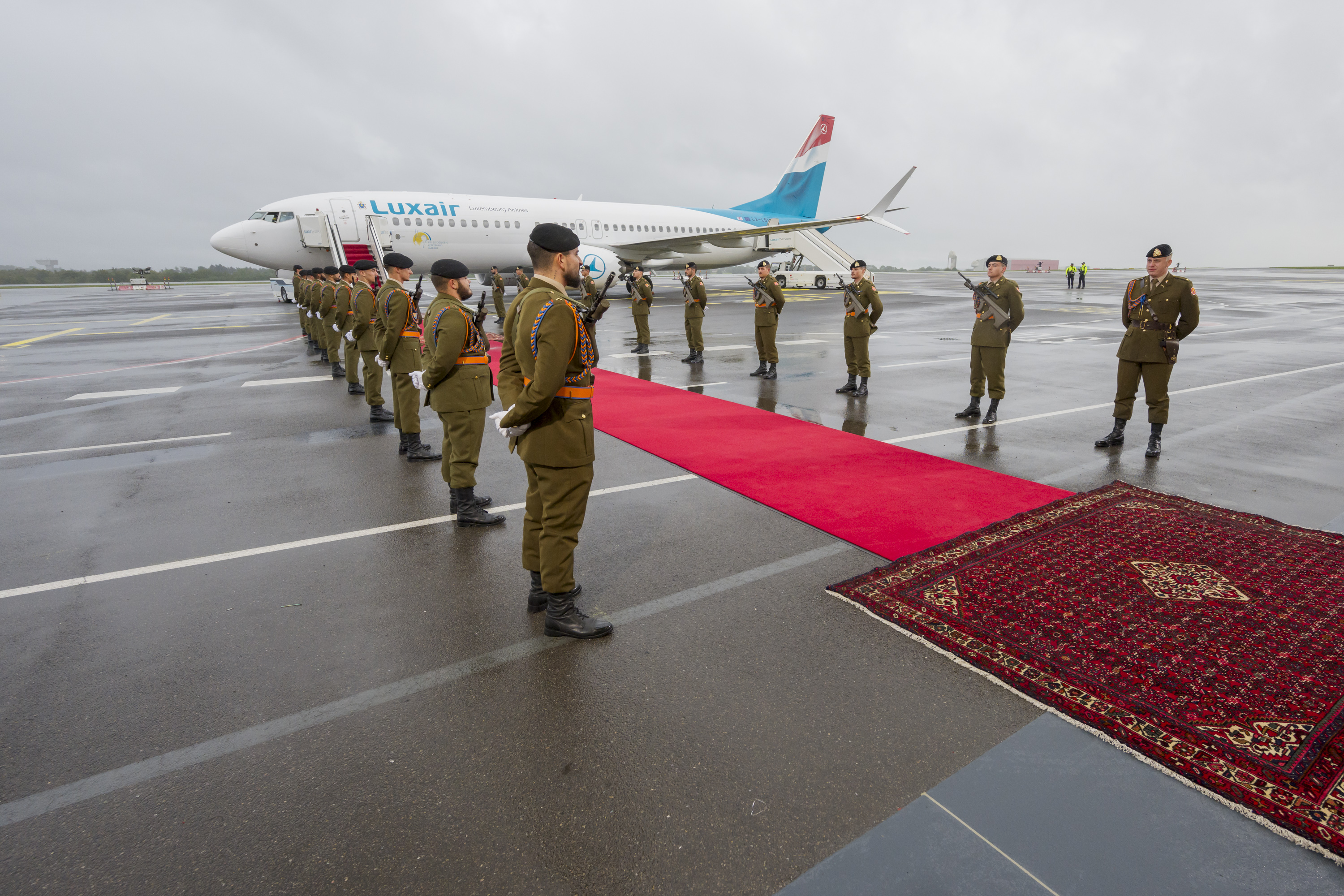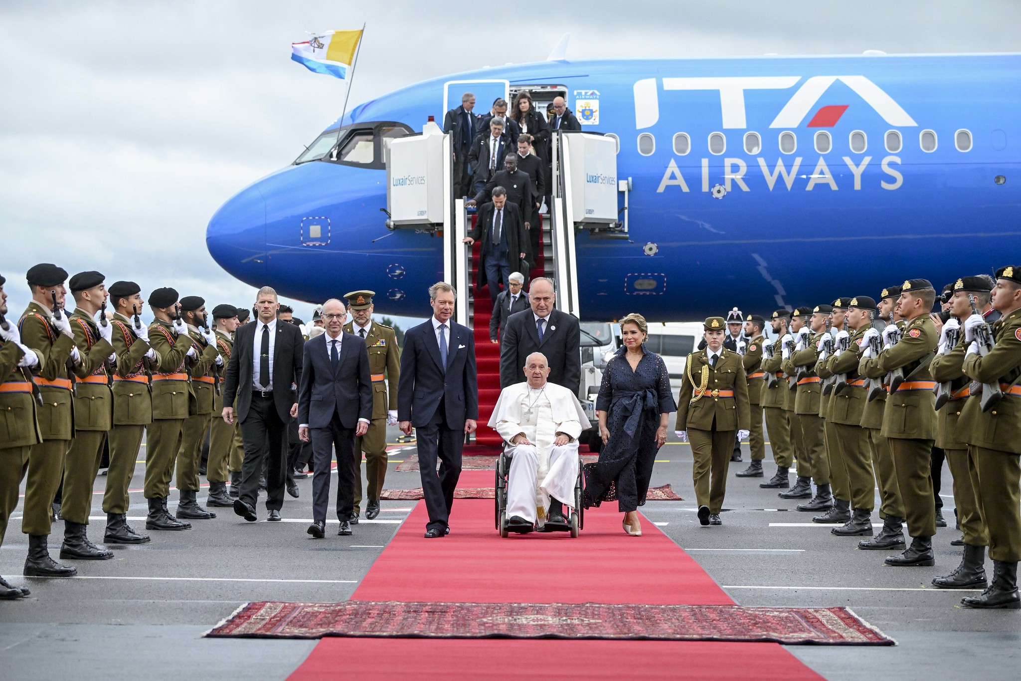 Bei senger Arrivée zu Lëtzebuerg gëtt Seng Hellegkeet de Poopst Franziskus vum Grand-Duc an der Grande-Duchesse zesumme mam Premierminister Luc Frieden empfaangen. Nom Virspille vun den Nationalhymne ginn déi offiziell Delegatioune virgestallt.